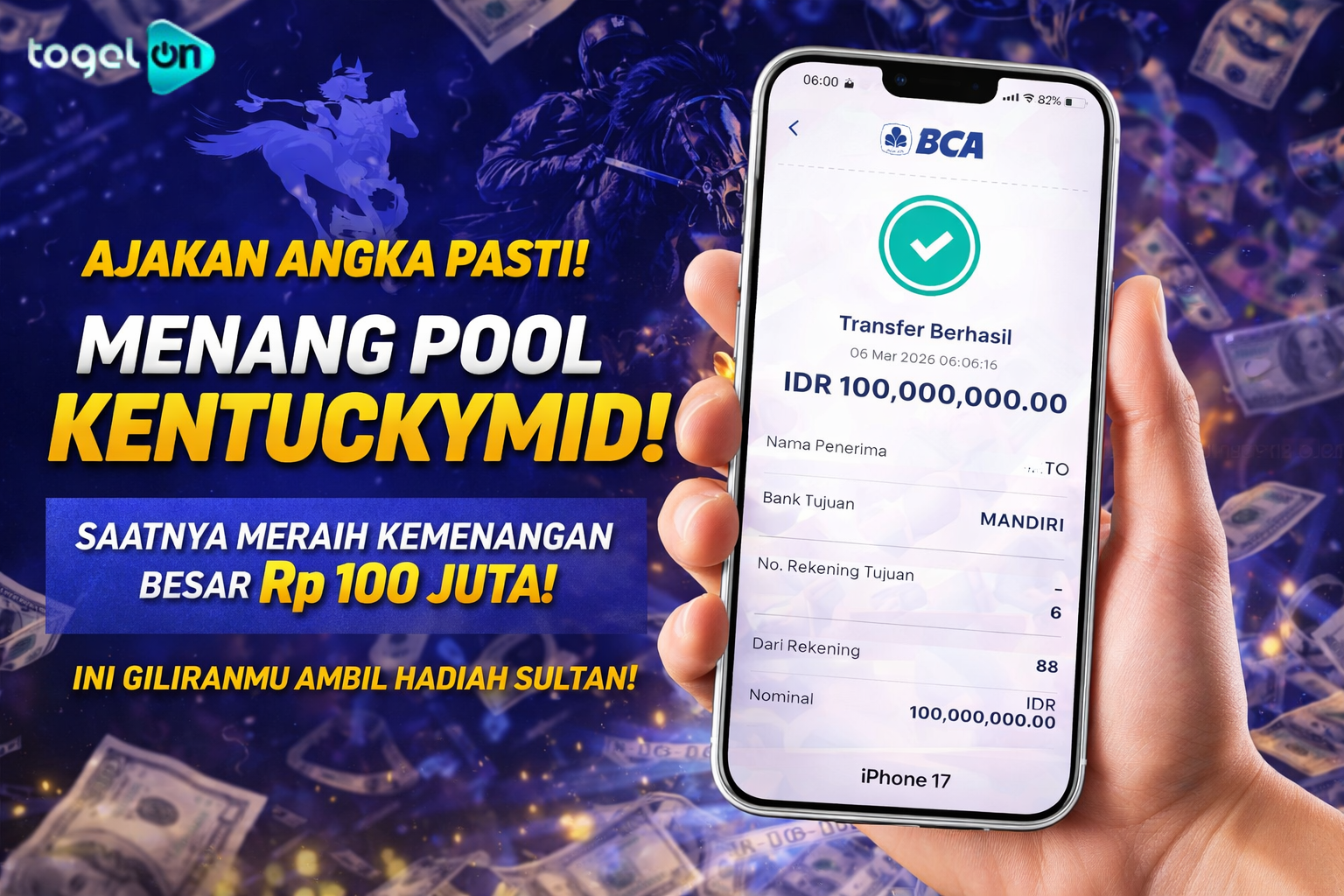 Selamat untuk kemenangan besar member setia TogelOn dengan user id :Â axxxxx8Â Â telah Jackpot besar pada Pasaran Pool KENTUCKYMID